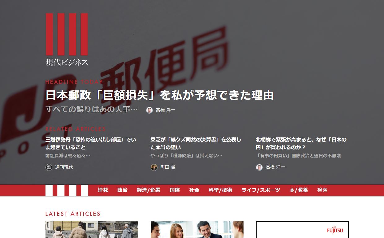 | サイト内容 | 「現代ビジネス」は、第一線で活躍するビジネスパーソン、マネジメント層に向けて、プロフェッショナルの分析に基づいた記事を届ける新創刊メディアです。政治、経済からライフスタイルまで、ネットの特性を最大限にいかした新しい時代のジャーナリズムの可能性を追及します。 |