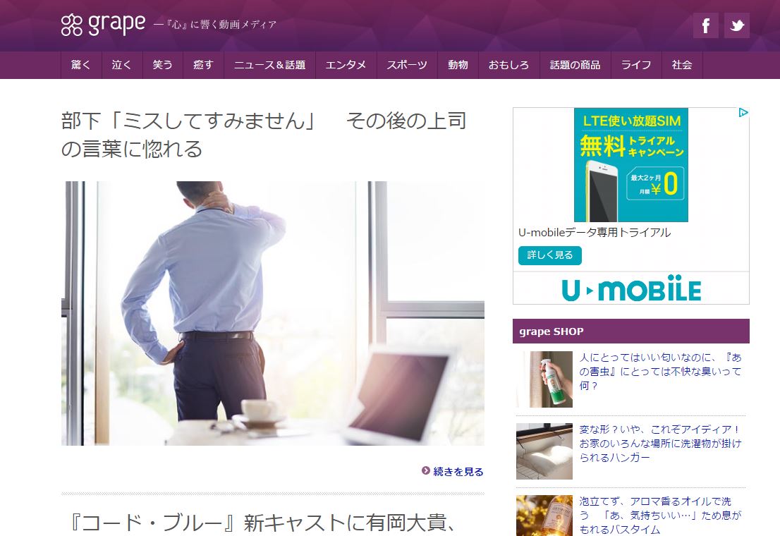 | サイト内容 | 『grape [グレイプ]』は、喜怒哀楽、心に響くコンテンツを動画・画像を中心にお届けするメディアです。あなたが出会うことがなかったかもしれない素晴らしいコンテンツを厳選してご紹介します。 |