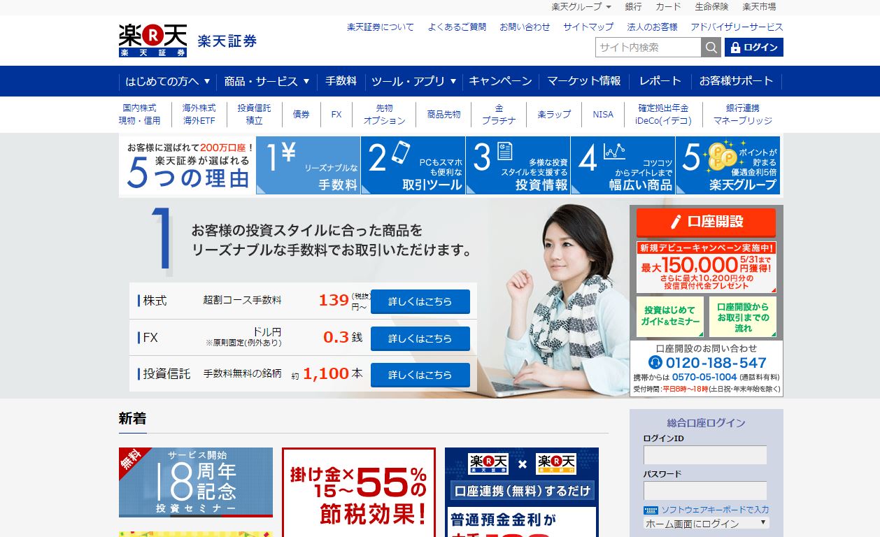 サイト内容  ネット証券・オンライン証券なら楽天証券!投資信託やFXが初心者にも選ばれるオンライントレードの証券会社です。株・FX・投資信託などの豊富な商品、格安手数料、マーケットスピードが魅力!株価のチェックも簡単なネット証券でオンライントレードを始めよう!