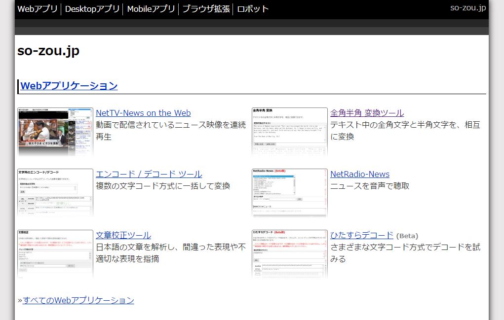 | サイト内容 | 省力化のためのツールを提供しています。そして新しいものを創りだす一助になることを願い、それの開発に要した技術も公開しています。 |