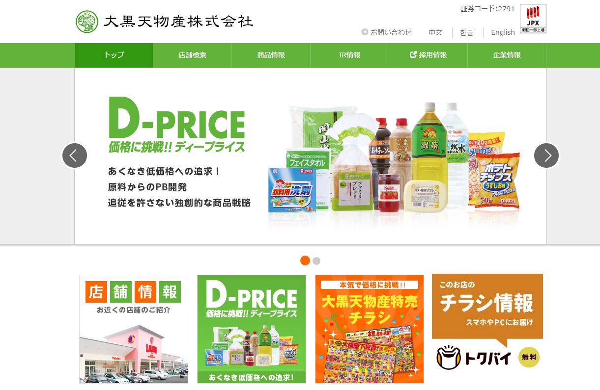 | サイト内容 | 大黒天物産 ~ 驚きの安さ!大フロアーの快適さ!24時間の便利さ!店舗のご案内とチラシの情報などを発信しています。 |