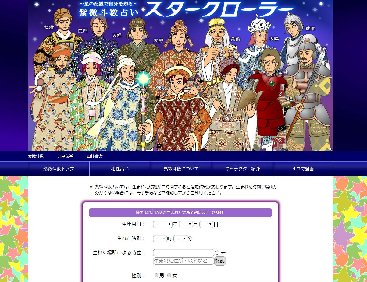 | サイト名 | 紫微斗数占いスタークローラー 紫微斗数占いをベースにした無料の運勢鑑定プログラム。生まれた時刻と場所で運勢・性格を判定。 |