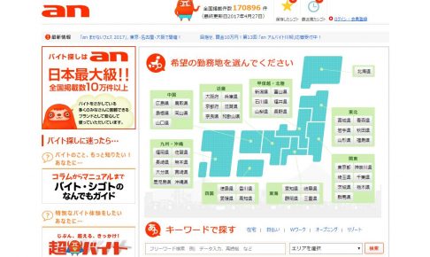 主要データ サイト名 バイト探しはan(アン)|アルバイト、バイト求人情報 サイト内容 an(アン)は、全国のアルバイト・バイト・パートの求人、募集情報からお好みの条件で仕事を検索できるサイトです。エリア・路線・駅の…