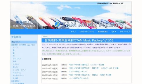 主要データ サイト名 TAM Music Factory – 使用フリーの音楽素材(MP3素材)・効果音素材 サイト内容 オリジナルの使用フリーの音楽素材・効果音素材を公開しています。MP3素材、Ogg素…