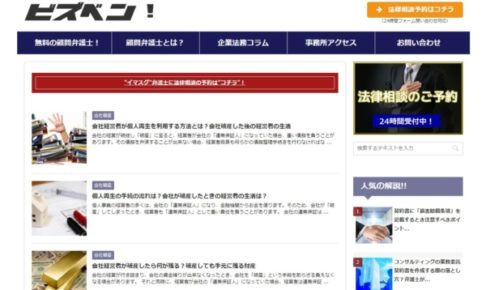 主要データ サイト名 経営者の顧問弁護士が企業法務を徹底サポート!! – 顧問弁護士の企業法務サポートなら「ビズベン!」 サイト内容 経営者の顧問弁護士が企業法務を徹底サポート!! サイトキーワード サイ…