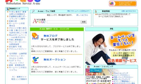 主要データ サイト名 A-aucホームページ:無料 インターネット サービス サイト内容 無料インターネット サービスの提供サイトです、 無料ブログ サービスや、 フリーサーバ ー サービス、 無料ウェブメール サー…