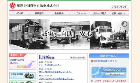 主要データ サイト名 姫路合同貨物自動車株式会社 サイト内容 姫路合同貨物自動車株式会社のホームページです。事業のご紹介のほか、宅配貨物追跡システムや、路線貨物のお問い合わせもご利用いただけます。 サイトキーワード …