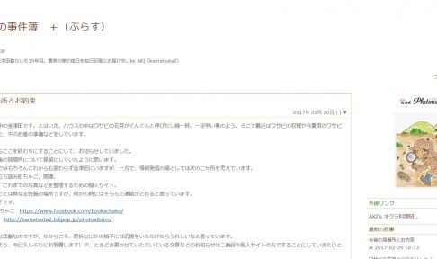 主要データ サイト名 農家の嫁の事件簿 +(ぷらす) サイト内容 北国岩手の山の中、釜津田暮らしも15年目。農家の嫁の毎日を絵日記風にお届け中。by AKI(kamatsuta2) サイトキーワード 農家の嫁の事件簿…