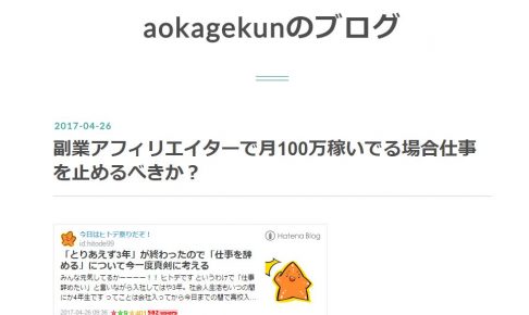 主要データ サイト名 ブロガーやめてアフィリエイターになりました サイト内容 ブロガーをやめてアフィカスになった男のブログ サイトキーワード アフィリエイト,アフィリエイター,ブロガー サイトURL http:/…