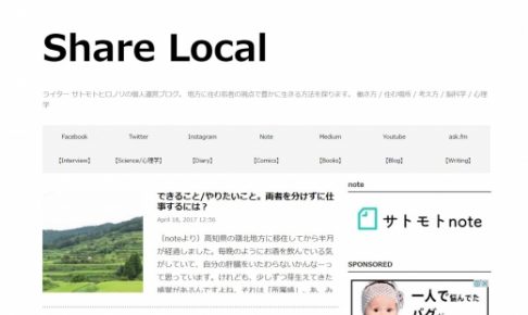 主要データ サイト名 Share Local-ライター サトモトヒロノリの個人運 営ブログ。 サイト内容 ライター サトモトヒロノリの個人運営ブログ。 地方に住む若者の視点で豊かに生きる方法を探ります。 働き方 / 住…