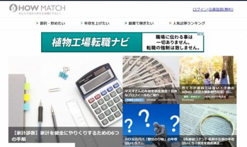 主要データ サイト名 HOW MATCH(ハウマッチ)|あなたの悩みと幸せを金額にすると? サイト内容 「あなたの悩みと幸せを金額にすると?」をコンセプトに、年収アップ、副業で稼ぐ、節約、貯蓄、貯金、投資、老後の悩み…