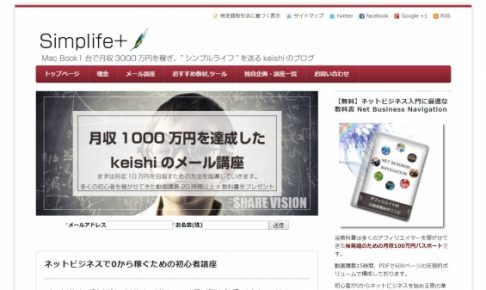 主要データ サイト名 Simplife + サイト内容 ネットビジネスで起業し、Mac book1台で稼ぎシンプルライフを送るkeishiのブログ サイトキーワード サイトURL http://keishixx.c…